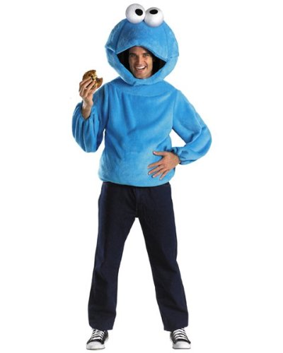 You'll be a sure fire hit with the kids this Halloween in our Adult Cookie Monster Costume. This officially licensed Sesame Street costume comes as a one piece blue shirt and a matching hood. The costume's shirt comes with long sleeves in a soft blue plush material. Attached to the shirt is an oversized hood in the same blue plush material. The oversized hood is actually Cookie Monster's head with your face showing through his mouth so you'll be talk and laugh easily. On top of the hood you'll find a large pair of plush white eyeballs complete with black pupils that give this costume's hood its trademark Muppet appearance. Try this one with a pair of blue pants and gloves if you want to make it a full body affair. Otherwise just put on the shirt and hood and watch the kids line up for Cookie Monster treats! Includes: Blue plush long-sleeve shirt and plush character headpiece. Size: Small (Fits most chest sizes 38-40) X-Lar ge (Fits most chest sizes 42-46) Pants and cookie not included.You will not be disappointed with