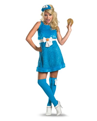 Me want cookies!!! But only if they're low fat! As a Sassy Cookie Monster you'll want to look you're best. This ladies version of the sugary sweet Cookie Monster features a bright blue plush dress with a white belt tied in a bow. The bow has a chocolate chip cookie pin with a bite taken out of it. Cookie Monsters big googly eyes have been fashioned into a headband so you can wear your hair any way you please. The costume also includes blue thigh high tights with white bows at the top. Accessorize with white shoes or heels. Everybody loves Cookie Monster so don't miss the chance to look as sweet as can be. If you and your friends are going to a party you may consider taking a walk down Sesame Street together all dressed as different Sesame Street characters. What a blast! Features a plush dress, knee high stockings and a character headband. Size: Small (4-6), Medium (8-10), Large (12-14) Features a plush dress, knee high stockings and a character headband. Cookie and boots not included. This is an officially licensed costume.You will not be disappointed with